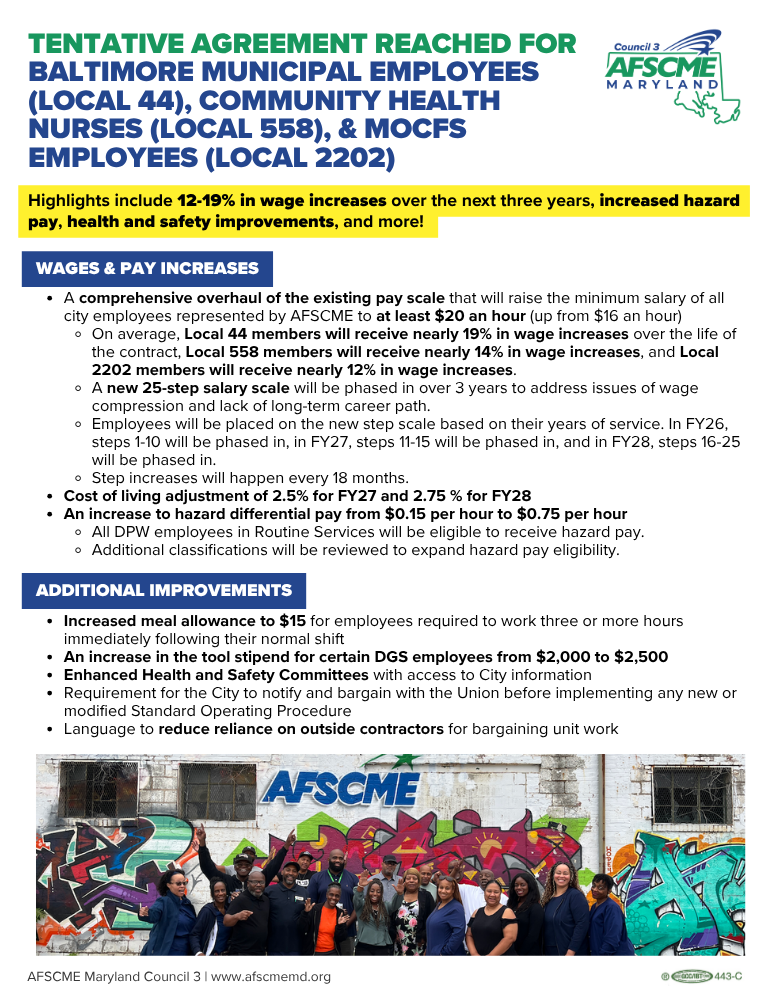 The next step for finalizing Local 44’s new contract for municipal employees includes confirming the accuracy of the new pay scale and wage increases and finalizing ratification details. In this historic agreement, members will see record pay raises — including changes to the pay scale, step increases every 18 months, and an increase in hazard pay — as well as health and safety improvements among other wins. You can learn more here.